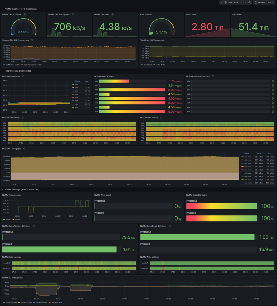 I now have a 54TB RAID6 pool with ~1TB NVMe writeback cache. Random I/O performance is significantly improved. The monitoring stack gives me visibility into drive health and I/O patterns above and beyond the minimal UI stuff (which isn’t bad, unless you care about long-term metrics).
